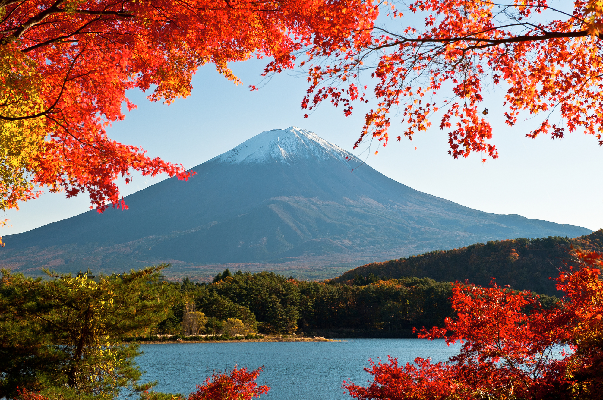 湖畔を彩る紅葉と雄大な富士山のコラボレーションは、まさにこの時期だけの特別な景色。